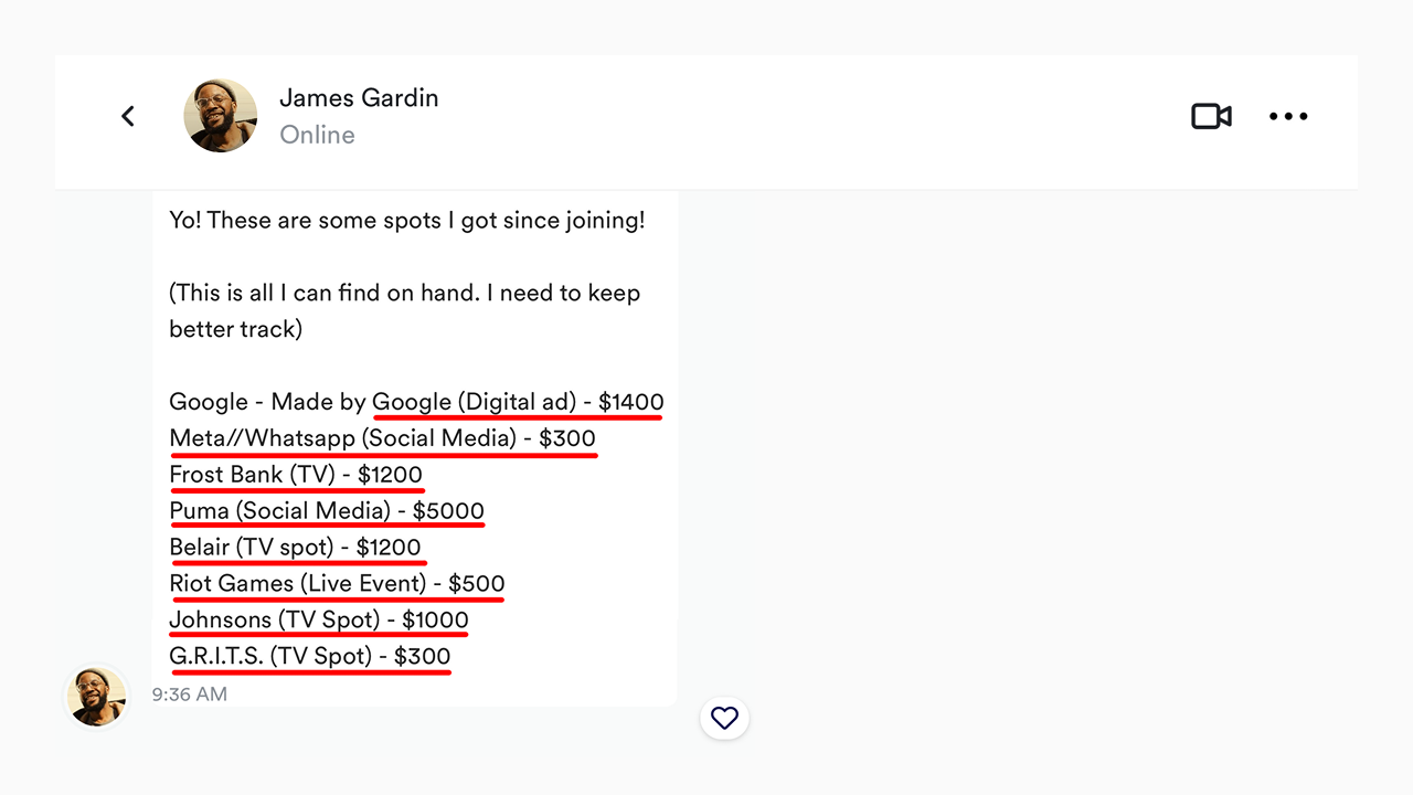 Netflix, Gatorade, NCAA, NBA, MTV, NBC, CBS, VH1, CW, UFC, NFL, ESPN, Help! I’m In A Secret Relationship, Teen Mom – MTV, Love Is Blind – Netflix, The Kardashians – Hulu, Onside: Major League Soccer – Apple TV, Google Gemini – Google, Basketball Wives, Black Ink Crew – VH1, Welcome to Wrexham – FX, Zabka Polska Ad, Rainbow6Game, UFC – ESPN, NFL Wild Card Ad, Righteous Thieves – Prime Video, All American – The CW, Carlos Alcaraz: My Way