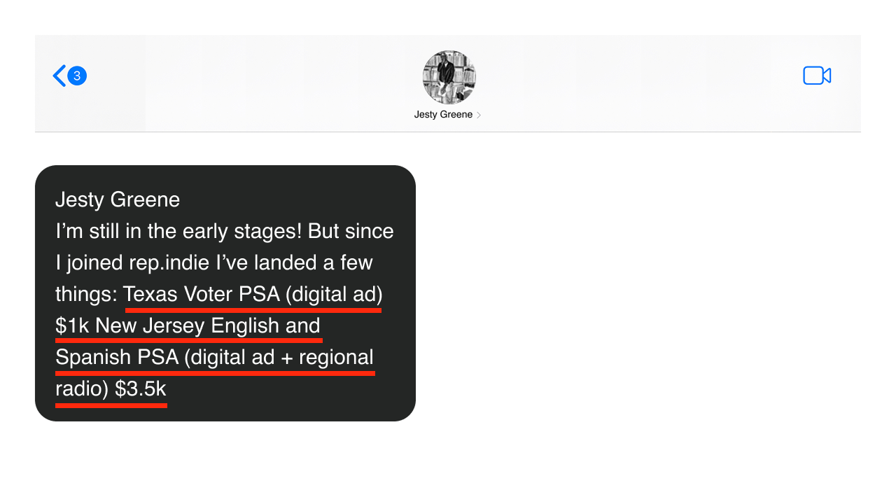 After joining rep.indie, I built a real process around creating and pitching music. I’ve submitted to more opportunities than ever before and finally have a support system that helps me execute my ideas. I’ve gotten more music signed for representation during my time with rep.indie than I had in my entire career up to that point.